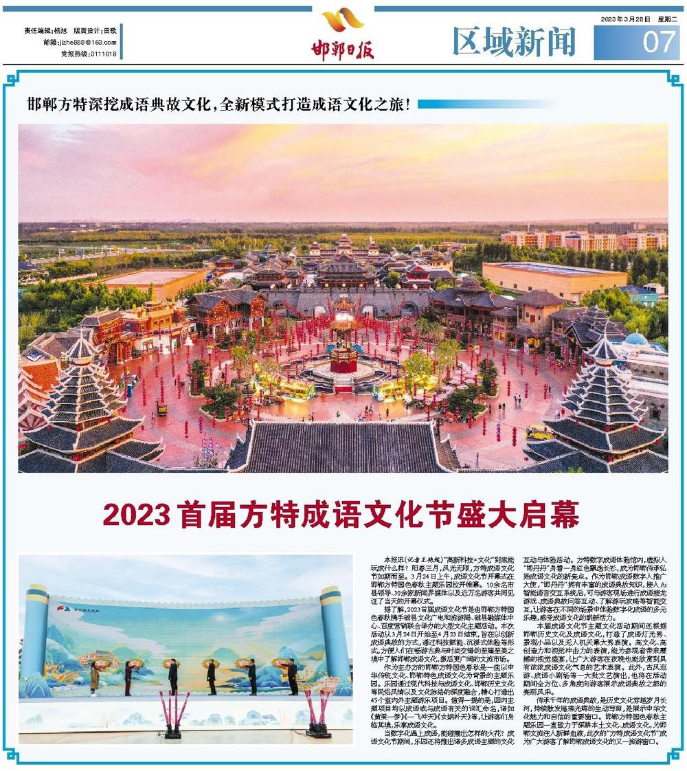 本報訊(記者王艷超)“高新科技+文化”到底能玩成什么樣?陽春三月,風光無限,方特成語文化節(jié)如期而至。3月24日上午,成語文化節(jié)開幕式在邯鄲方特國色春秋主題樂園拉開帷幕。10余名市縣領導、30余家新聞界媒體以及近萬名游客共同見證了當天的開幕儀式。據(jù)了解,2023首..