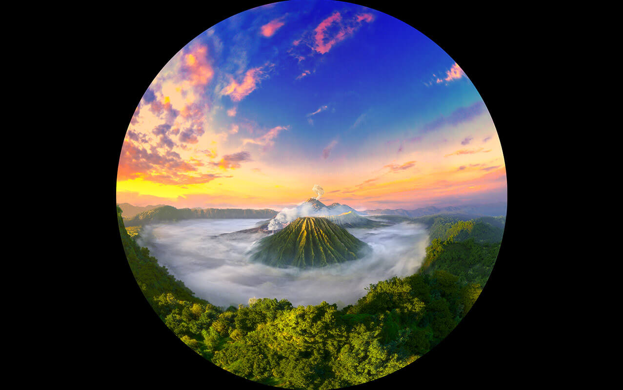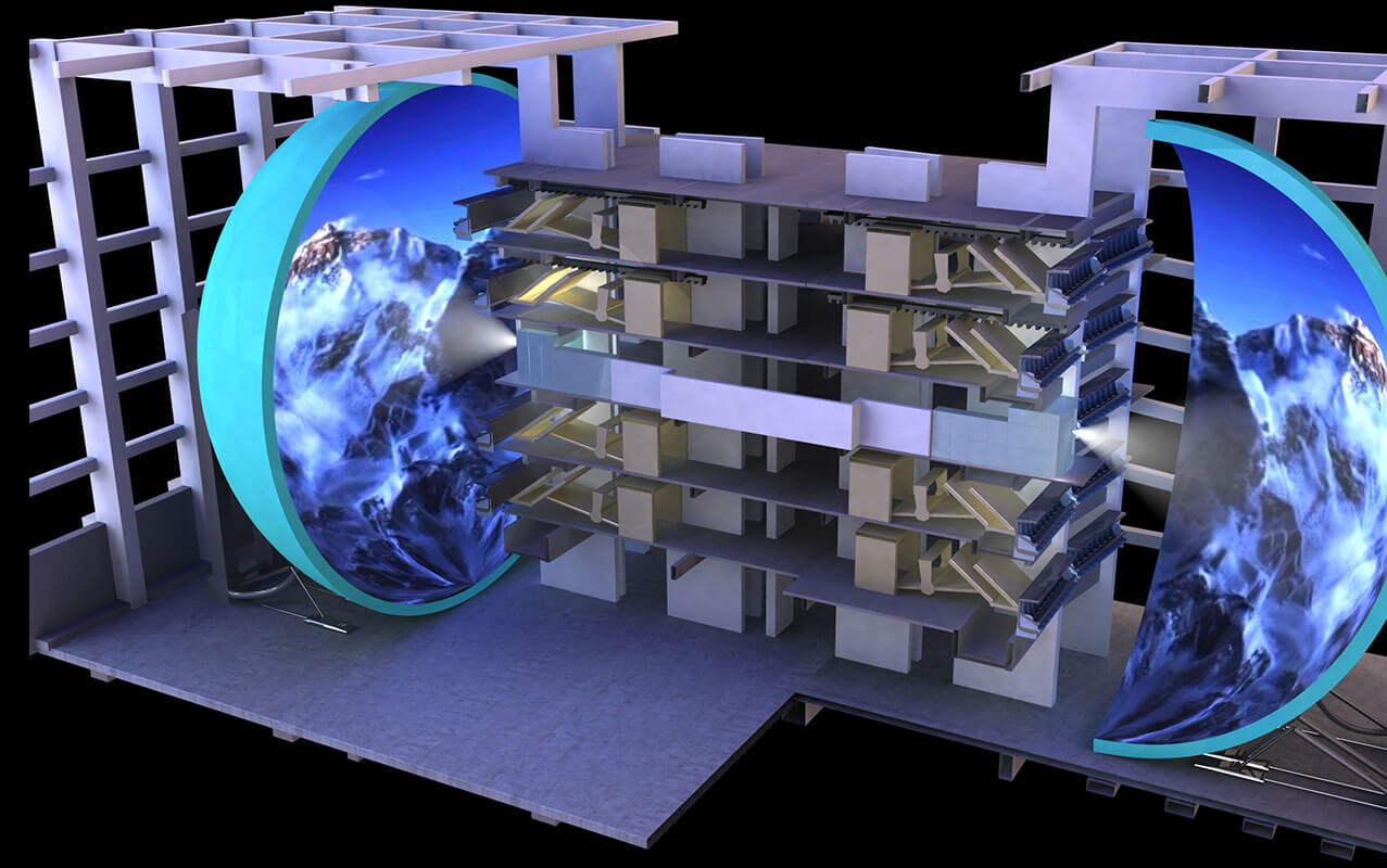 球幕投影系統(tǒng)包含高清晰度球幕設(shè)計(jì)、高清晰度投影系統(tǒng)設(shè)計(jì)以及大張角魚眼鏡頭設(shè)計(jì)等幾部分。球幕影院屏幕呈半球形,游客被包圍其中,給游客無邊界,接近真實(shí)的視覺感受。結(jié)合懸掛式行模擬器座椅模擬影片鏡頭運(yùn)動(dòng),為游客創(chuàng)造出良好的觀影效果。